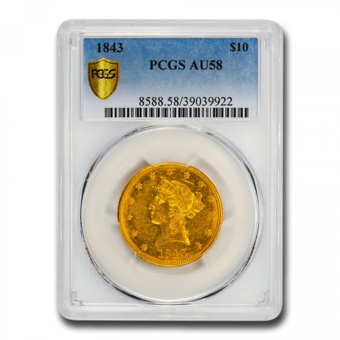 This 1843 $10 Liberty Gold Eagle has been certified as AU-58 by PCGS, one of the top two coin grading services.