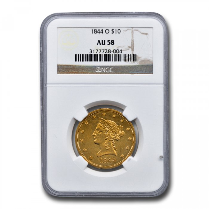 This 1844-O $10 Liberty Gold Eagle has been certified as AU-58 by NGC, one of the top two coin grading services.