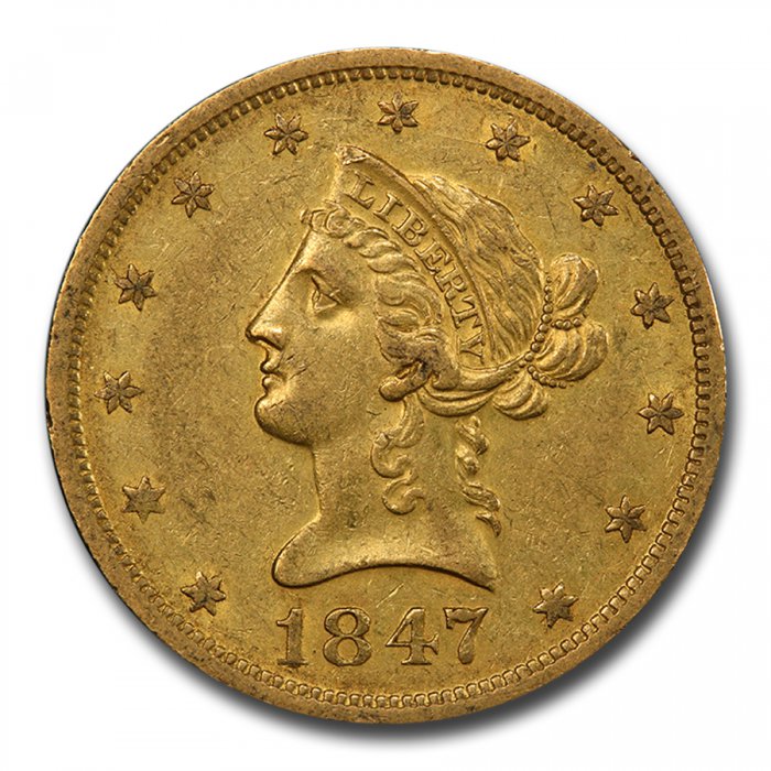 This 1847-O $10 Liberty Gold Eagle has been certified as AU-53 by PCGS, one of the top two coin grading services. This coin has a population of only 62 coins!