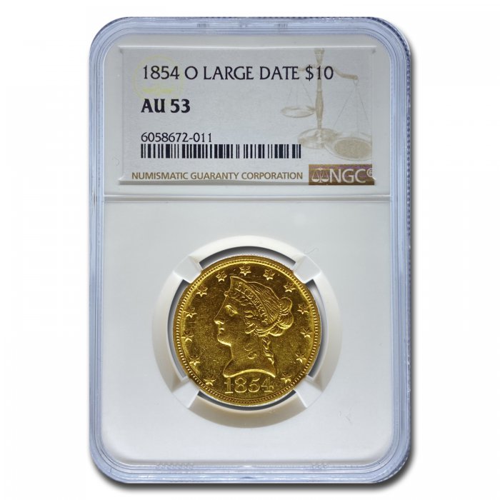 This 1854-O $10 Liberty Gold Eagle (Large Date) has been certified as AU-53 by NGC, one of the top two coin grading services. This coin has a population of only 30 coins!