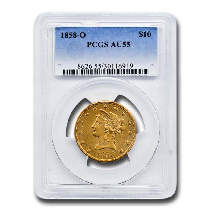 This 1858-O $10 Liberty Gold Eagle has been certified as AU-55 by PCGS, one of the top two coin grading services. This coin has a population of only 27 coins!