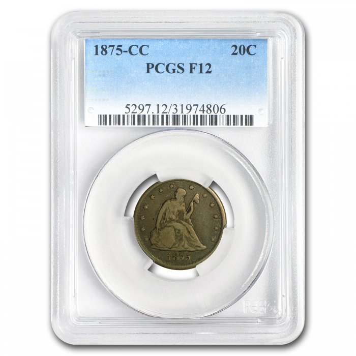 This 1875-CC Twenty Cent Piece has been graded and guaranteed by PCGS as being in Fine-12 condition. This semi-key date coin is choice for the grade.