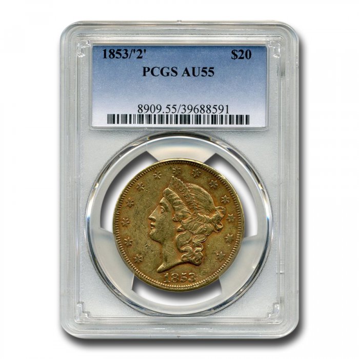 This 1853/2 $20 Liberty Gold Double Eagle has been certified as AU-55 by PCGS, one of the top two coin grading services.
