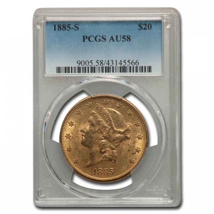 This 1885-S $20 Liberty Gold Double Eagle has been certified as AU-58 by PCGS, one of the top two coin grading services. This coin has a population of only 258 coins!