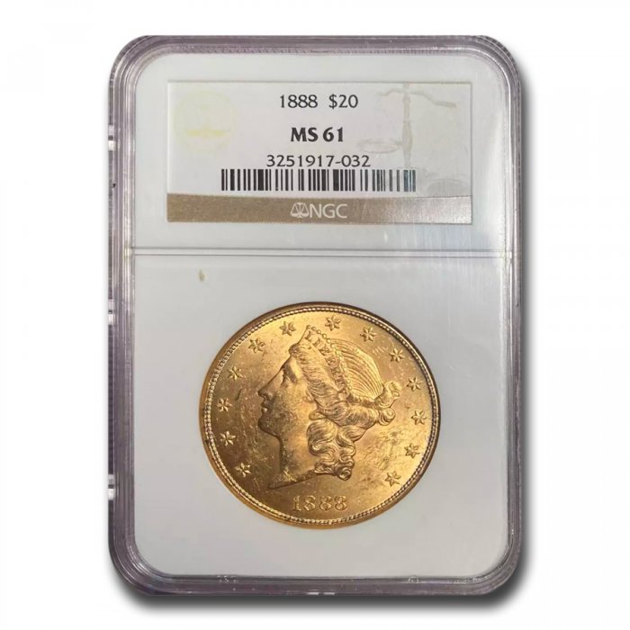 This 1888 $20 Liberty Gold Double Eagle has been certified as MS-61 by NGC, one of the top two coin grading services.