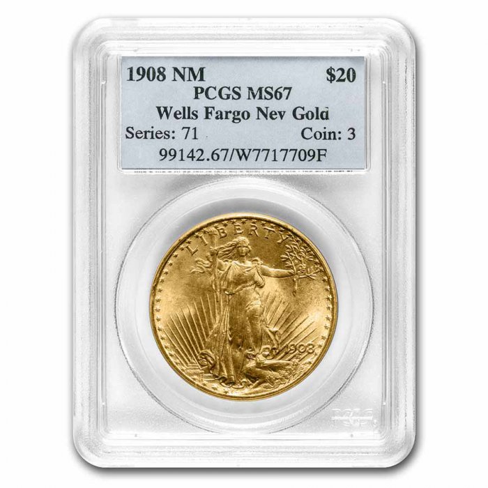 As a general rule of thumb, all 1908 Wells Fargo pedigreed $20 Saints are extremely nice and eye appealing, this one is no exception. Graded by PCGS as MS-67, this is one of the finest known examples!
