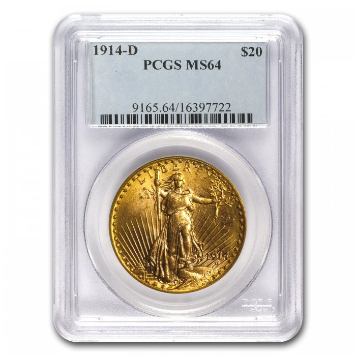 This 1914-D $20 Saint-Gaudens Gold Double Eagle has been certified as MS-64 by PCGS, one of the top two coin grading services. This highly collectible coin is a great addition to any numismatic collection!