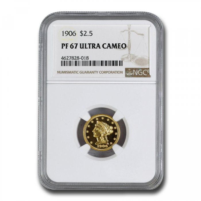This 1906 $2.50 Liberty Gold Quarter Eagle has been certified as PF-67 UCAM by NGC, one of the top two coin grading services.