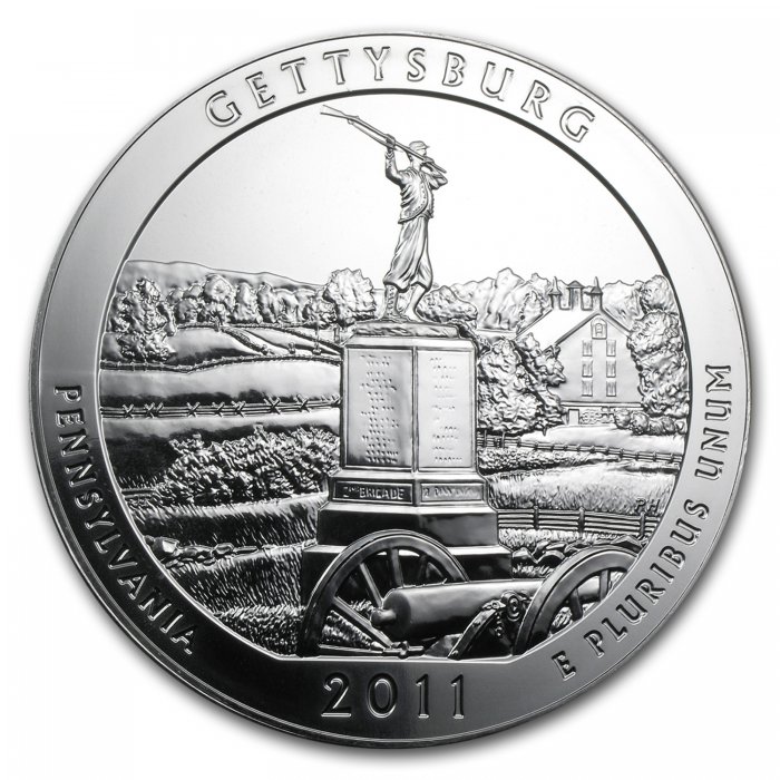 The ninth coin of the United States America the Beautiful Silver Bullion Coin? Program features Gettysburg National Military Park in Pennsylvania. The America the Beautiful coin contains 5 oz of .999 fine Silver.