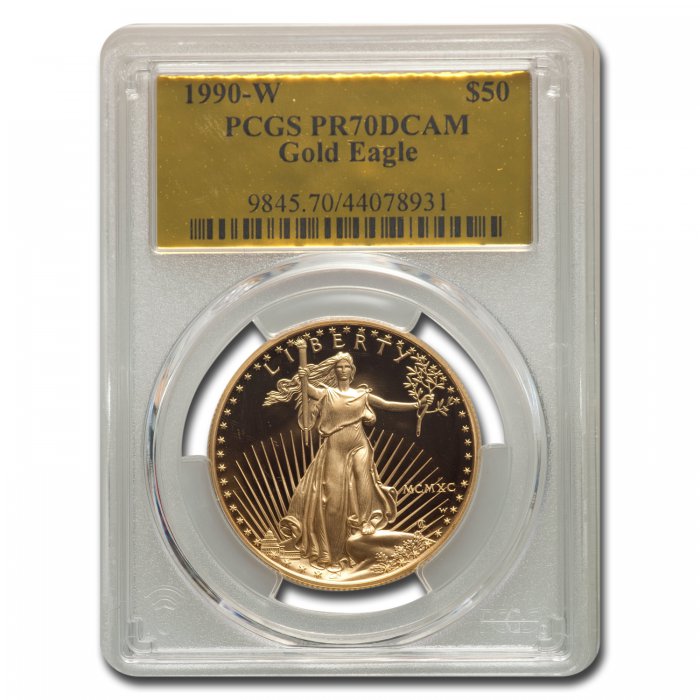 The Gold American Eagle features a classic design and contains 1 oz of Gold, making it among the most popular Gold coins in the world. This example has been guaranteed to be in perfect 70 condition by PCGS, a top coin grading service.