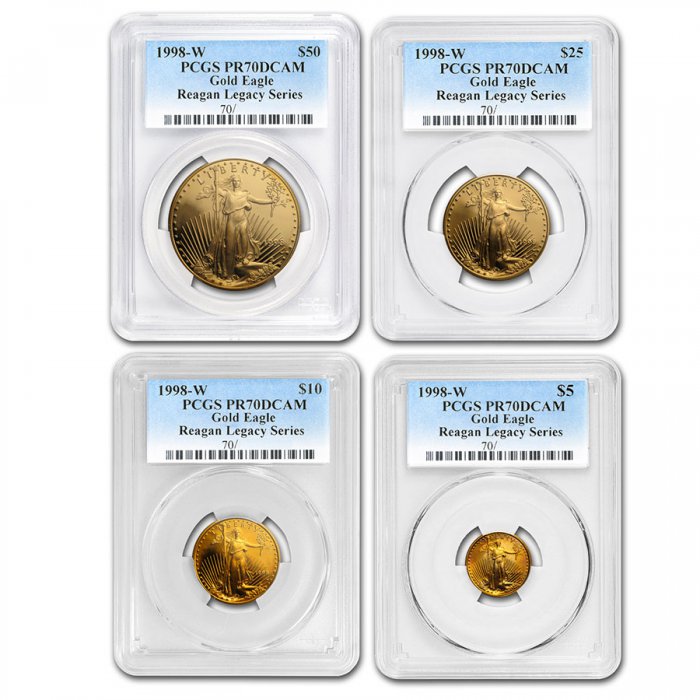 The Gold American Eagle is based on Augustus Saint-Gaudens' 1907 $20 Gold Double Eagle, showing a proud Lady Liberty. With an iconic design and PCGS certification, this 1998 Gold Eagle set combines collectibility with bullion appeal.