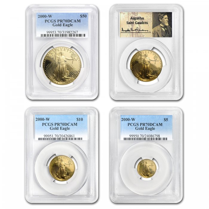 Showing a proud Lady Liberty, the Gold American Eagle is based on Augustus Saint-Gaudens' 1907 $20 Gold Double Eagle. With an iconic design and PCGS certification, this 2000 Gold Eagle set combines collectibility with bullion appeal.
