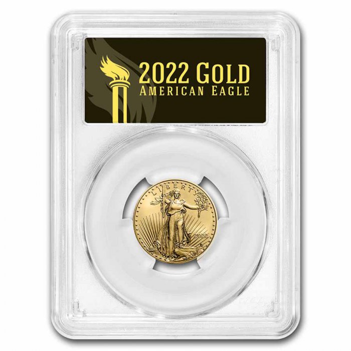 This 2022 Gold Eagle has a PCGS MS-70 PCGS grade, signifying the bullion's impeccable condition.