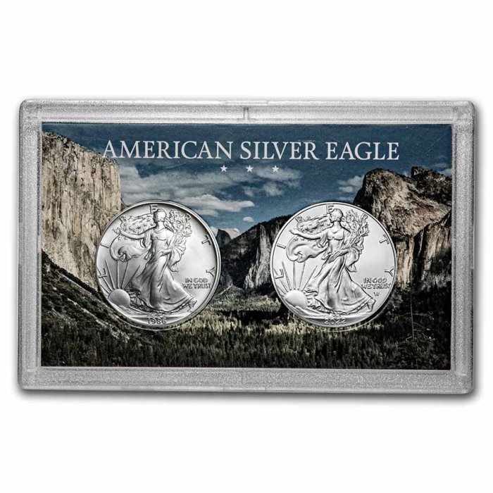 This two-coin Harris Holder accompanies the inaugural 1986 1 oz Silver Eagle and the 2022 1 oz Silver Eagle. Perfect combination for those looking to collect and protect their coins in style with a beautiful image of the Yosemite Park in the background.