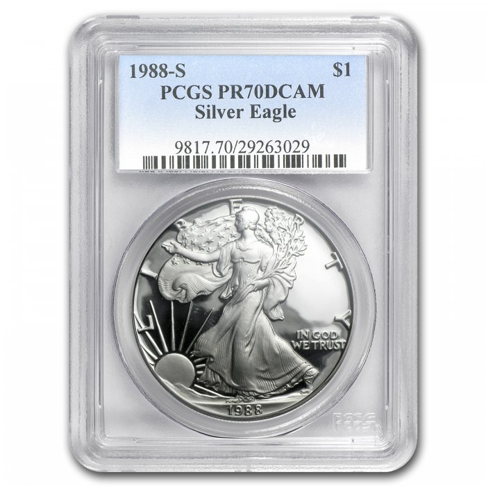 The mirrorlike finish on this Proof Silver American Eagle adds to the beauty of the beloved design. This American Silver Eagle is a practical purchase for every investor.