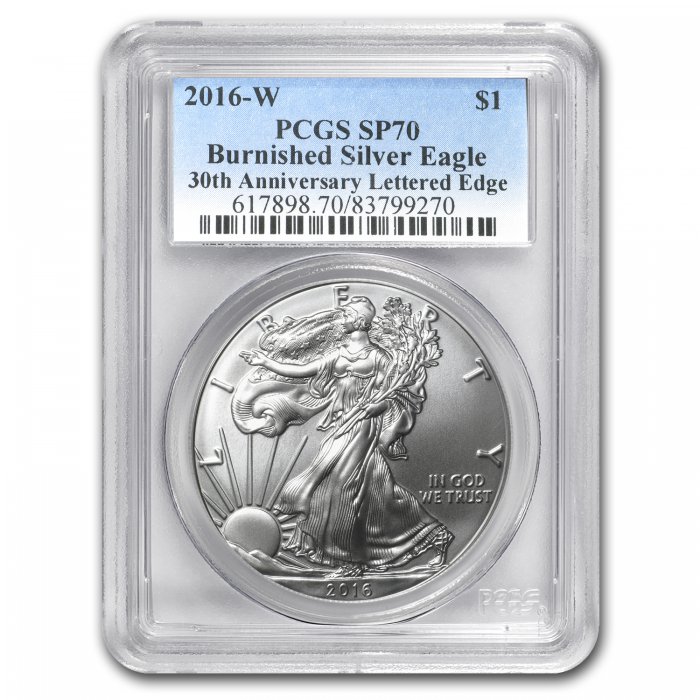 This Silver Eagle features a special burnished finish, West Point's "W" mint mark, and a lettered edge commemorating the 30th anniversary of the Silver Eagle series. This example has been graded a perfect SP-70 by PCGS.