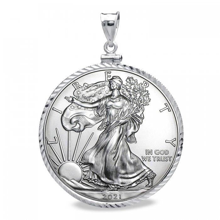 This pendant is a Silver bezel trimmed with a diamond-cut design that comes complete with the beautiful 2021 1 oz Silver American Eagle. The Silver Eagle is the most popular Silver coin in the world.