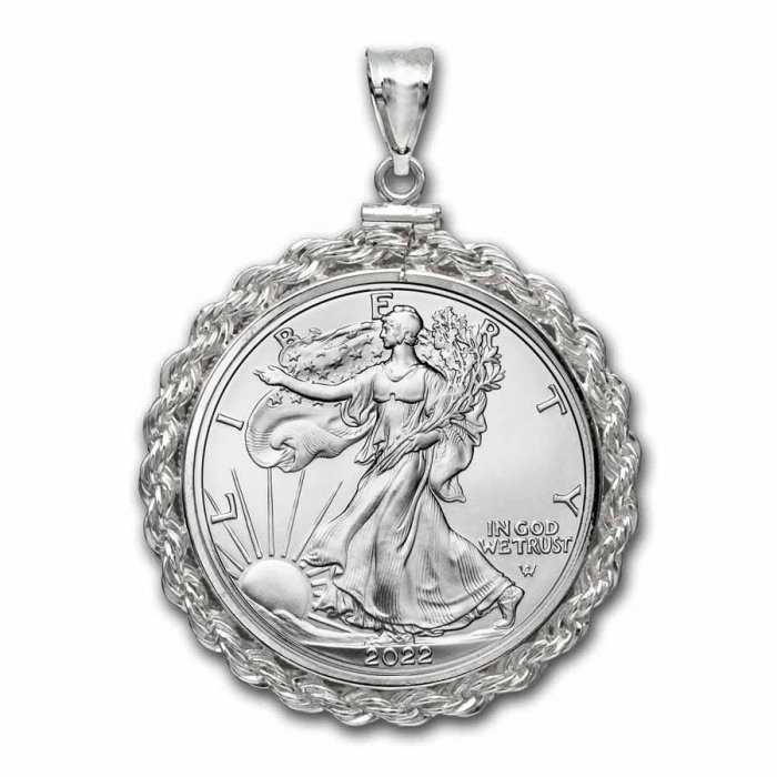 This pendant is a Silver bezel trimmed with a rope design that comes complete with the beautiful 2022 1 oz Silver American Eagle. The Silver Eagle is the most popular Silver coin in the world.