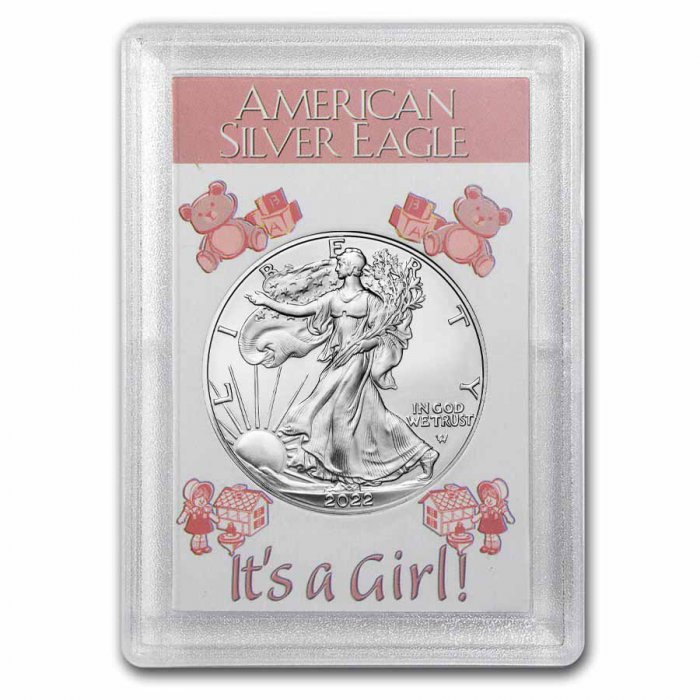 - Each Silver Eagle coin comes housed in a Harris Holder with an insert that features an adorable, baby girl themed design.