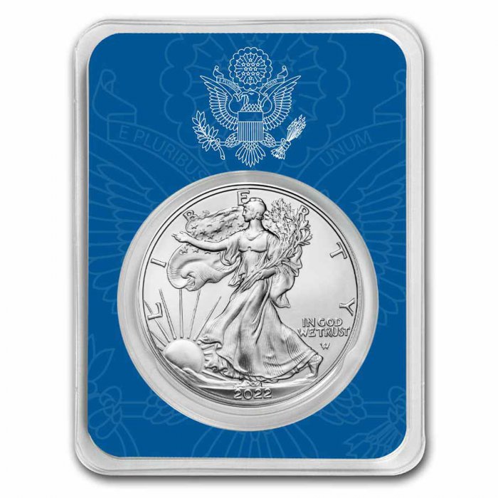 - Individual coin is sealed in tamper-evident packaging. The blue card insert features the Great Seal of the United States along with close-up silhouette of the same emblem.