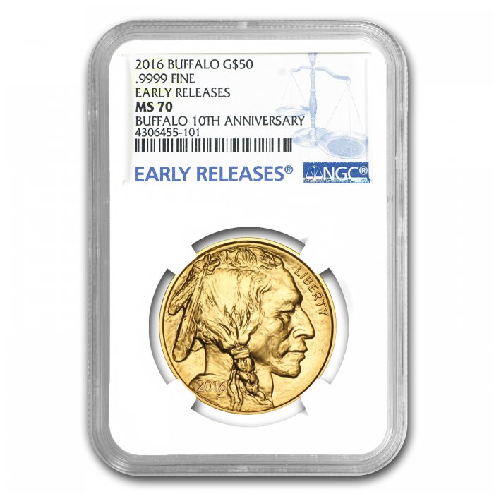 The Gold Buffalo series combines the investment potential of .9999 fine Gold with the timeless appeal of the historic Buffalo Nickel design. This 2016 example has been graded a perfect 70 by NGC, one of the world's leading coin grading services.