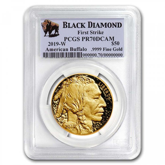 The popular Gold Buffalo, in a beautiful Proof finish, has been certified a perfect PR-70 by PCGS and bears the desirable First Strike Black Diamond label, an