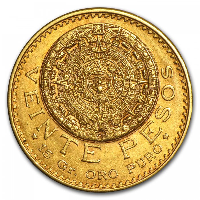 • Reverse: "Veinte Pesos" surrounding the Cuauhxicalli Eagle Bowl Aztec Calendar or Sun Stone.