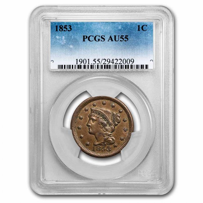 This 1853 Large Cent has been certified as AU-55 by PCGS, one of the top two coin grading services. This coin has a population of only 158 coins!