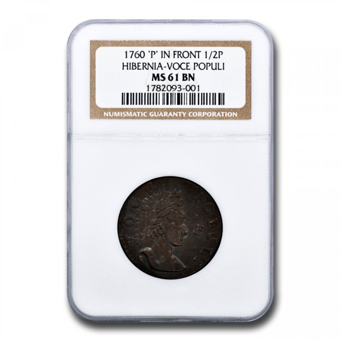This is a superb Hibernia VOCE POPULI halfpenny coin. It has been graded as Mint State-61 Brown by NGC with a nice problem-free dark brown planchet. This "P" at Face variety is a wonderful coin that will be appreciated by anyone who loves history.