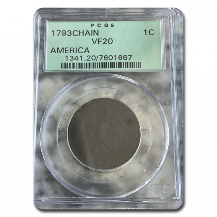 This 1793 Chain Large Cent (America) has been certified as VF-20 by PCGS, one of the top two coin grading services. This coin has a population of only 3 coins.