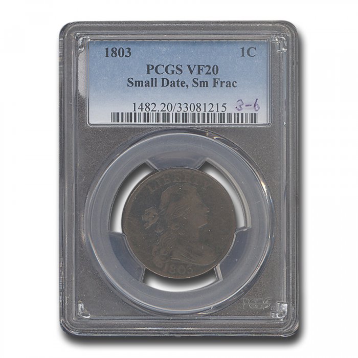 This 1803 Draped Bust Large Cent (Small Date, Sm Frac.) has been certified as VF-20 by PCGS, one of the top two coin grading services. This coin has a population of only 69 coins!