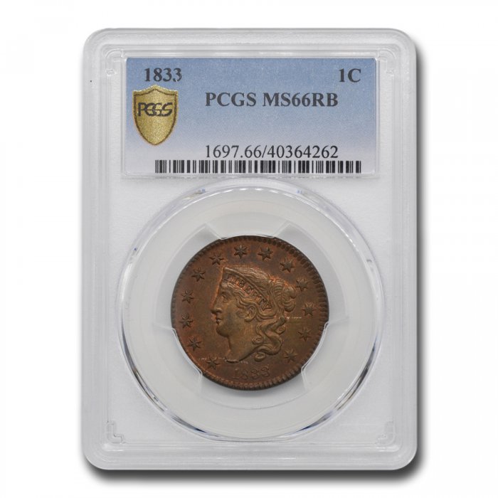 This 1833 Large Cent has been certified as MS-66 (Red/Brown) by PCGS, one of the top two coin grading services.