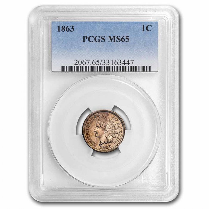 This 1863 Indian Head Cent has been certified as MS-65 by PCGS, one of the top two coin grading services. This highly collectible coin is a great addition to any numismatic collection!