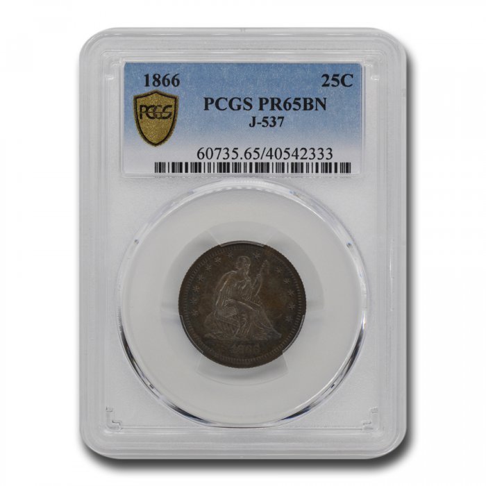 This 1866 Liberty Seated Quarter Pattern (J-537) has been certified as PR-65 (Brown) by PCGS, one of the top two coin grading services.