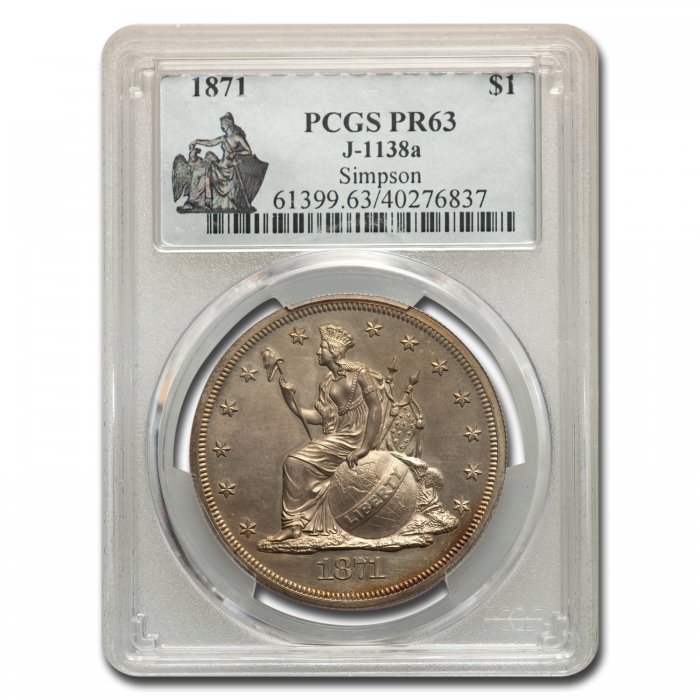 This 1871 $1 Pattern Dollar (J-1138a) has been certified as PR-63 by PCGS, one of the top two coin grading services. This coin has a population of only 2 coins!