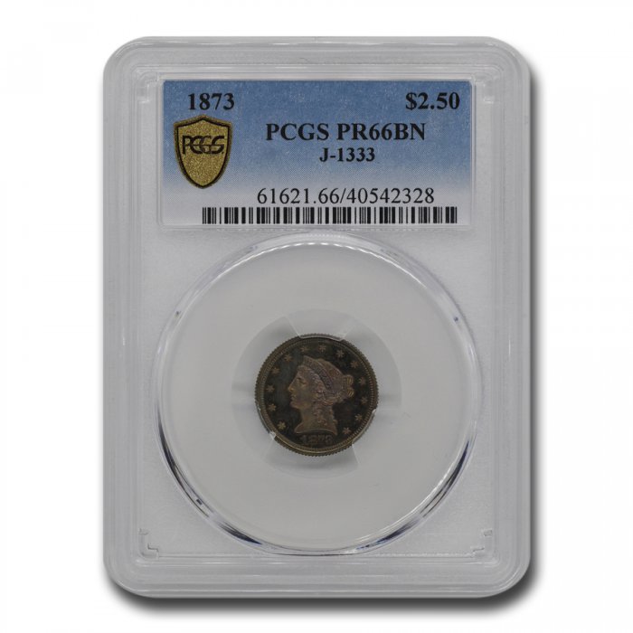 This 1873 $2.50 Liberty Quarter Eagle Pattern (J-1333) has been certified as PR-66 (Brown) by PCGS, one of the top two coin grading services.