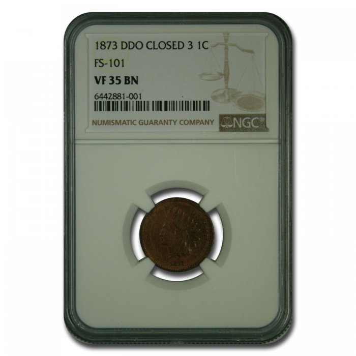 This 1873 Indian Head Cent (DDO Closed 3 FS-101) has been certified as VF-35 (Brown) by NGC, one of the top two coin grading services. This coin has a population of only 50 coins!