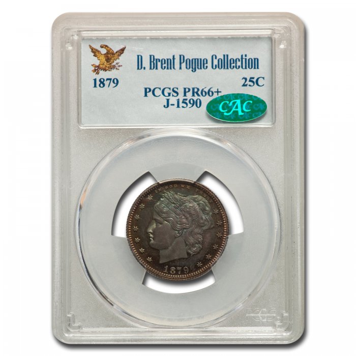 This 1879 Quarter Pattern (J-1590) has been certified as PR-66+ by PCGS, one of the top two coin grading services. This coin has a population of only 1 coin!