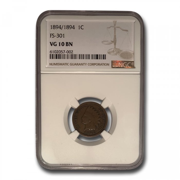 This 1894/1894 Indian Head Cent (VG-301) has been certified as VG-10 (Brown) by NGC, one of the top two coin grading services. This coin has a population of only 12 coins!
