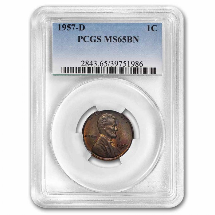This 1957-D Lincoln Cent certified MS-65 Brown by PCGS has attractive, natural toning. This is a great coin for a collector who appreciates subtle coloration in a brilliant copper coin.