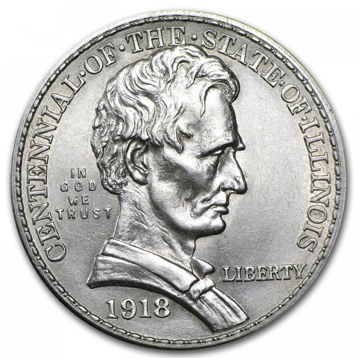 This coin was designed to honor the centennial of Illinois' admission into the Union. President Abraham Lincoln adorns the obverse of the coin and the Illinois State Seal is on the reverse.