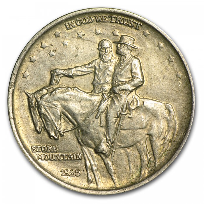 This commemorative half dollar was designed by Gutzon Borglum, who carved Mount Rushmore. The coins were sold to raise funds to complete the Confederate Memorial Monument in Stone Mountain, Georgia.
