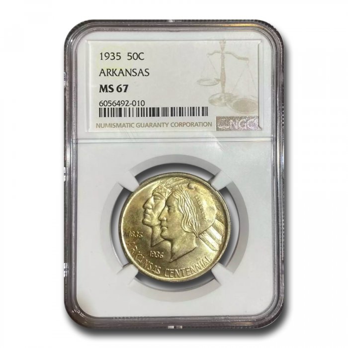 This 1935 Arkansas Centennial Commemorative Half Dollar has been certified as MS-67 by NGC, one of the top two coin grading services. This coin has a population of only 17 coins!