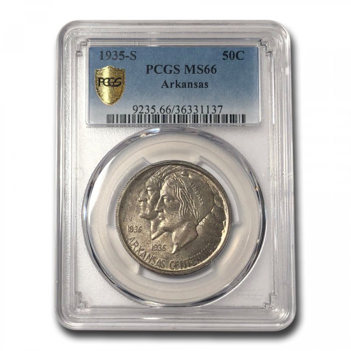 This 1935-S Arkansas Centennial Commemorative Half Dollar has been certified as MS-66 by PCGS, one of the top two coin grading services.