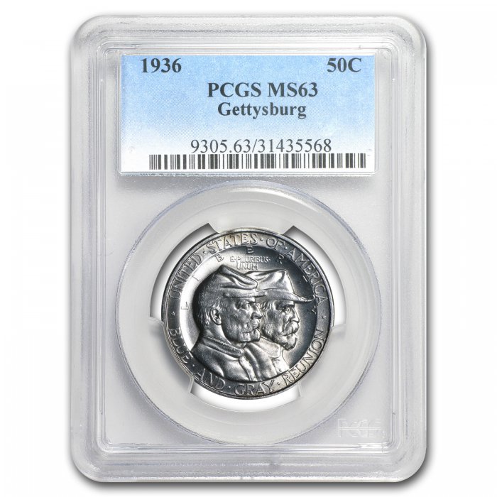 The 1936 Gettysburg Half Dollar prematurely commemorates and honors the 75th anniversary in 1938 of the Battle of Gettysburg. This coin has been graded MS-63 by PCGS.