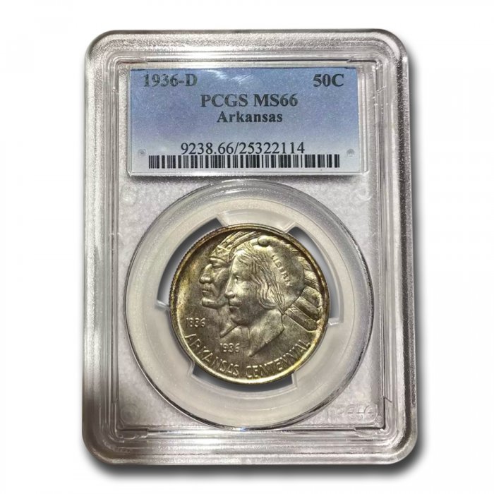 Beginning in 1935, the U.S. Mint produced this Silver Half Dollar coin to celebrate the 100th anniversary of Arkansas being admitted as a state. This issue has been graded an MS-66 by PCGS. This has some dark toning, adding to its originality.