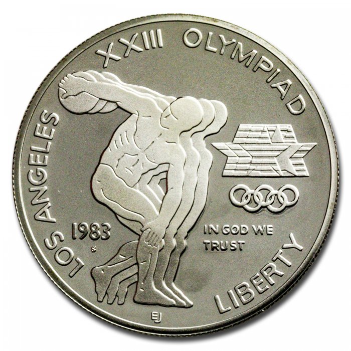 This Silver coin was the first coin issued to celebrate the XXIII Olympiad held in Los Angeles, California. The obverse of this 1983 issue features a depiction of a traditional Greek discus thrower. The reverse shows a profile of a bald eagle.