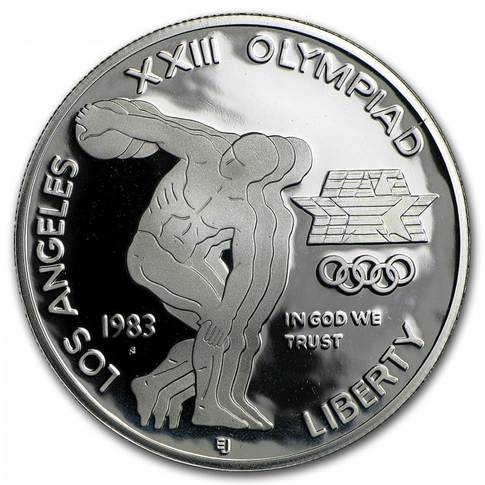 This Silver coin was the first coin issued to celebrate the XXIII Olympiad held in Los Angeles, California. The obverse of this 1983 issue features a depiction of a traditional Greek discus thrower. The reverse shows a profile of a bald eagle.