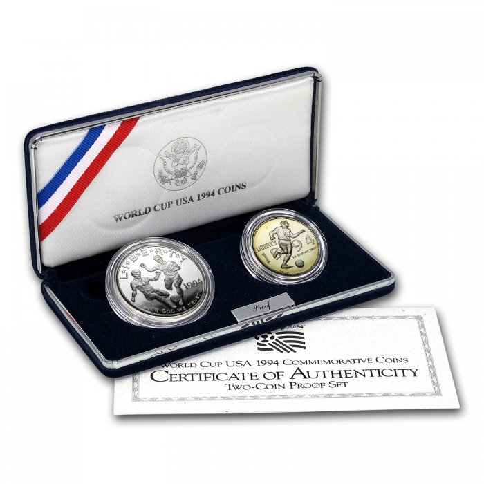 The U.S. Mint produced Proof Silver coins in 1994 to celebrate the first World Cup Soccer Championship played in the United States. This set contains the Silver dollar and clad half dollar coins displayed in a mint-issued case.