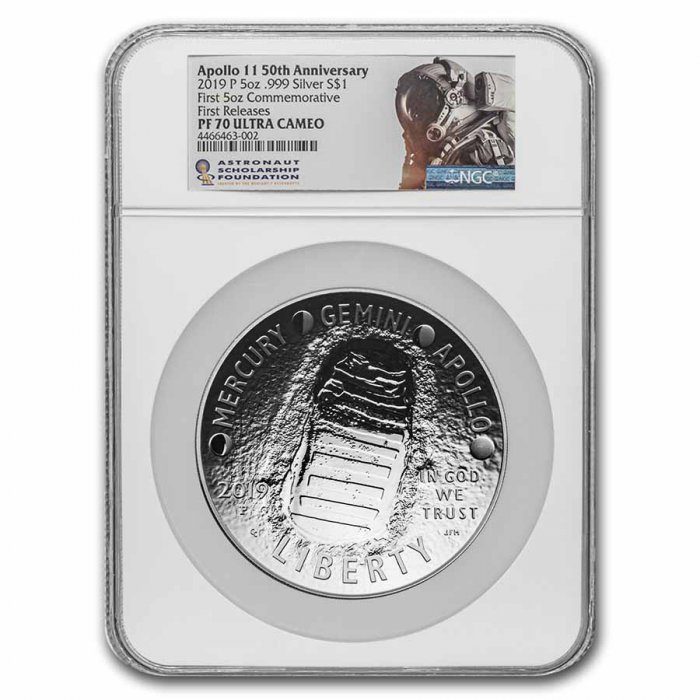 This Apollo 11 50th anniversary commemorative is the first-ever domed 5 oz Silver coin from the U.S. Mint.